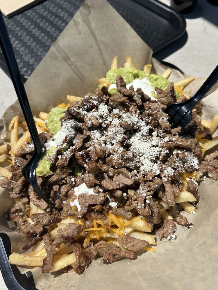 Carne asada from Choice Black Angus beef, guacamole, sour cream, cheddar and cotija cheese.