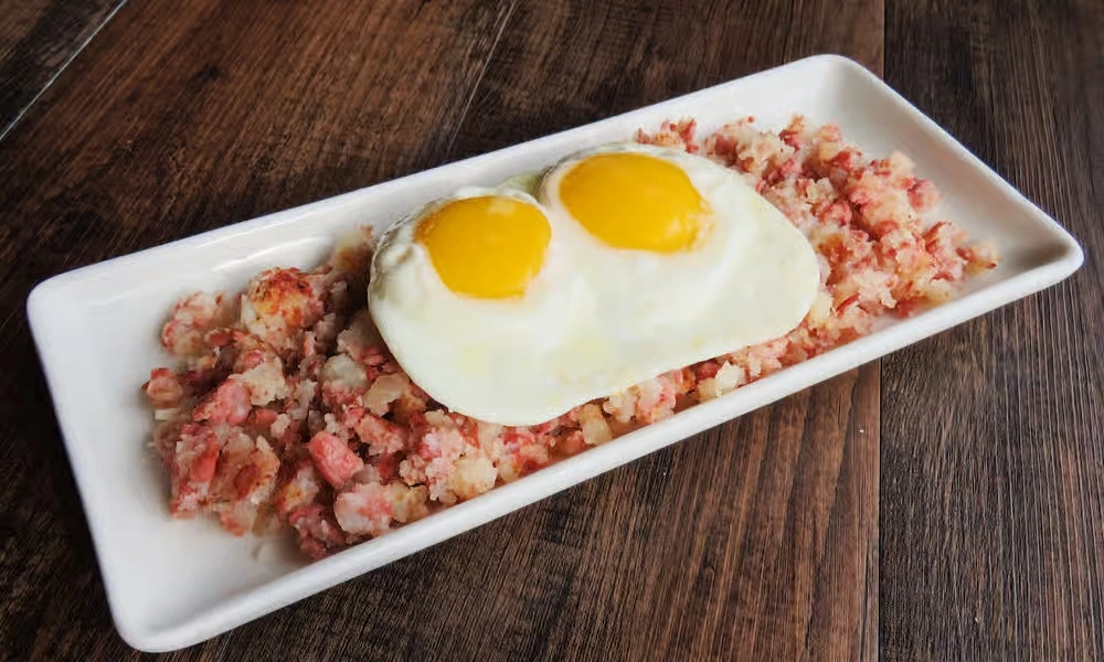 beef patty, portuguese linguisa sausage, muenster cheese, egg any style, spinach, fried onion, and thousand island spread on a brioche bun, served with house potatoes