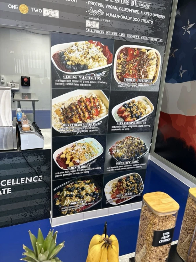 Acai topped with coconut oil, granola, banana, strawberry, blueberry, co…